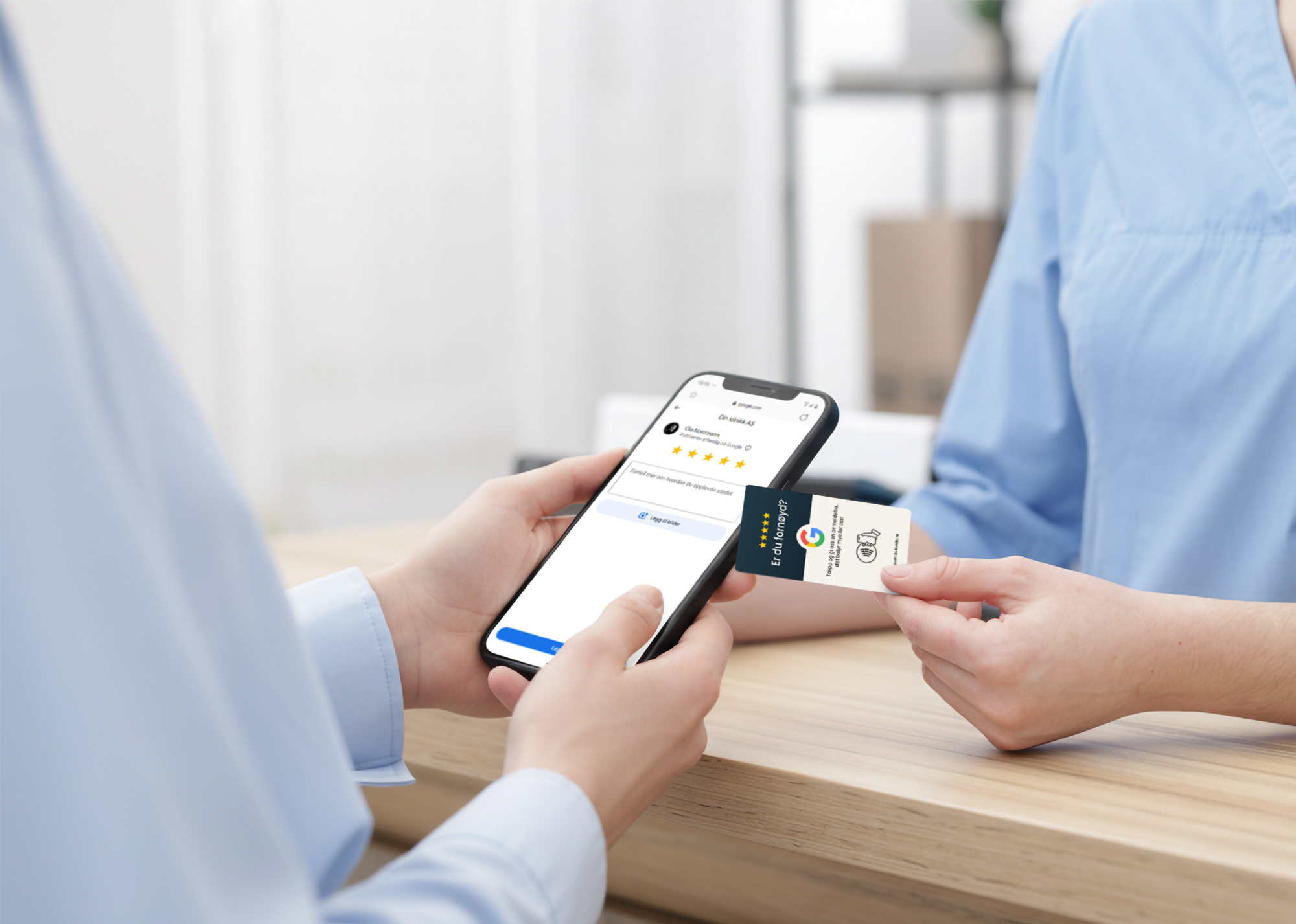 Kortet du har fått inneholder en liten NFC-brikke som gjør det enkelt for kundene dine å gi en anmeldelse. Når man holder mobiltelefonen inntil kortet, sendes en link automatisk til telefonen, helt uten behov for QR-kode eller en app. Linken fører pasienten direkte til klinikkens anmeldelsesside, for eksempel på Google, slik at de raskt og enkelt kan legge igjen en tilbakemelding.